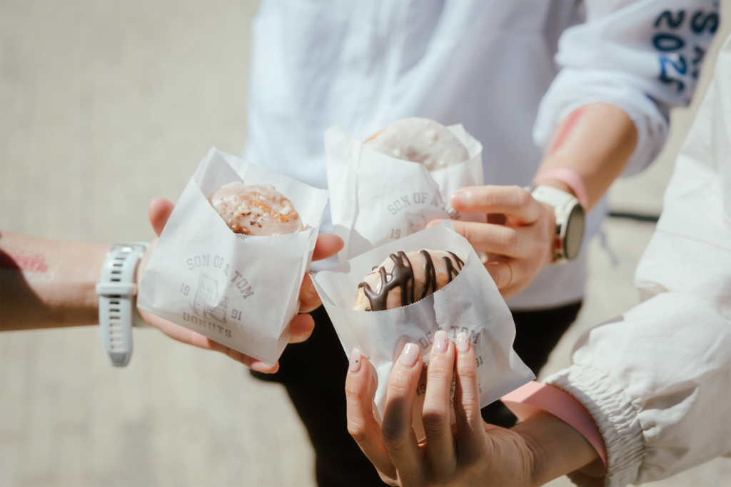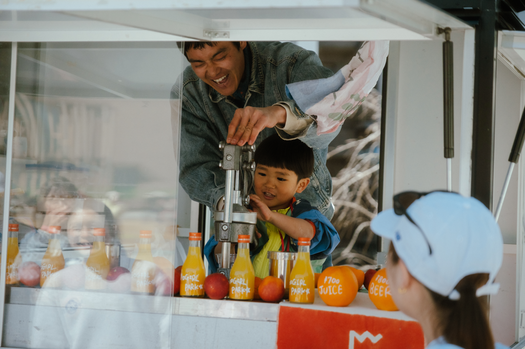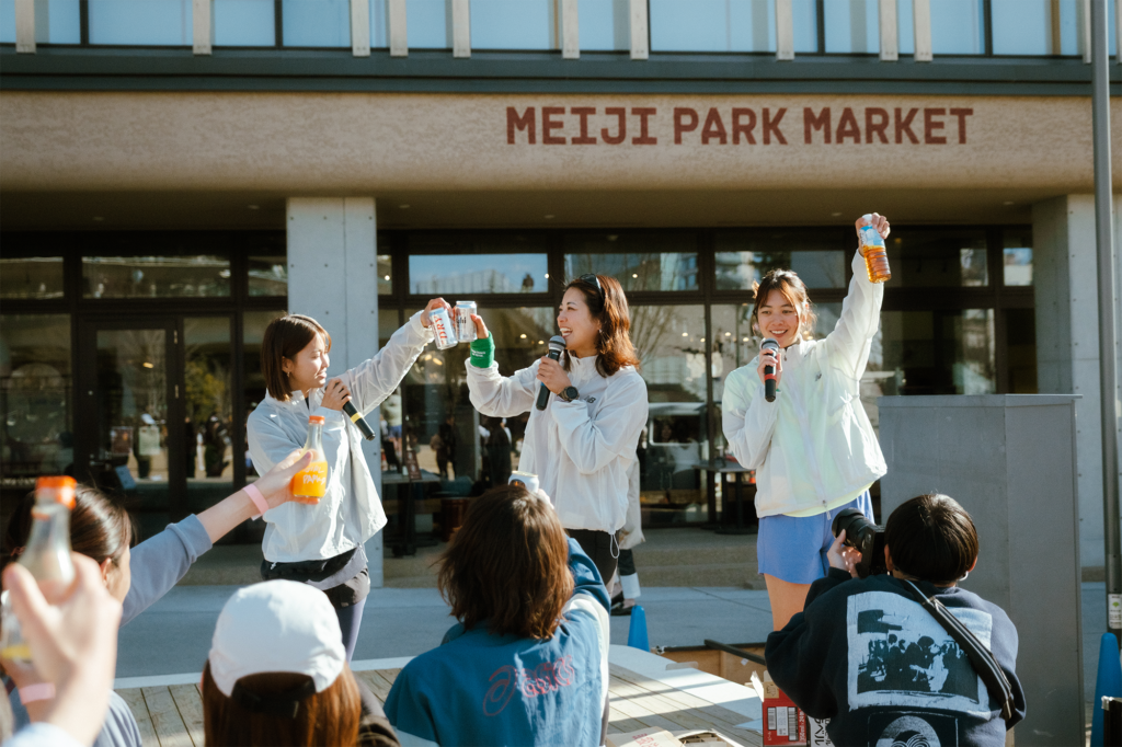 会場内には、ランニングやプログラムの合間にふらっと立ち寄れるキッチンカーやマルシェも登場。この日は薄着でも過ごせるほどのポカポカ陽気だったこともあり、芝生の上にシートを広げてドーナツや生搾りジュースを味わったりと、誰もが思い思いのピクニック気分を満喫していました。