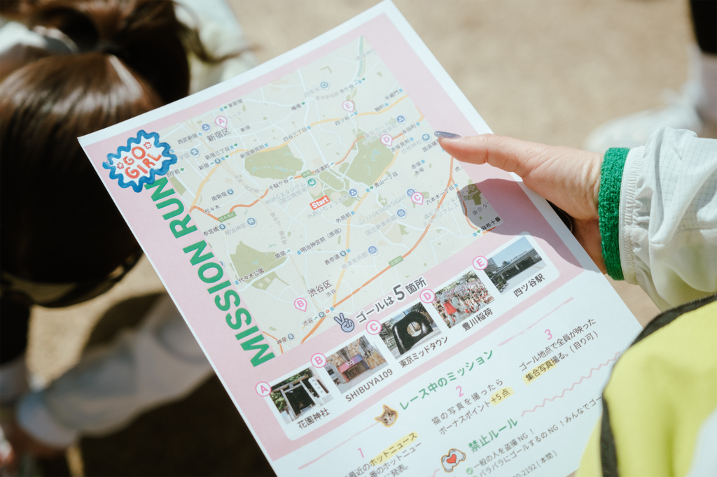 実はこのプログラムも、Ellipseとリンクした企画のひとつ。スタート地点から5km圏内に設定された5カ所のゴールを目指し、地図を見ながらチームごとにルートを戦略立てていく中で、“走り方はひとつじゃない”というメッセージを体感的に共有する時間となりました。さらに今回は「街の中で猫の写真を撮ってくる」というユニークなお題も!本物の猫はもちろん、看板のイラストや置物など、チームごとに自由な発想で「猫」を探し出し、ワイワイと写真を撮りながらミッションをクリアしていく姿が印象的でした。