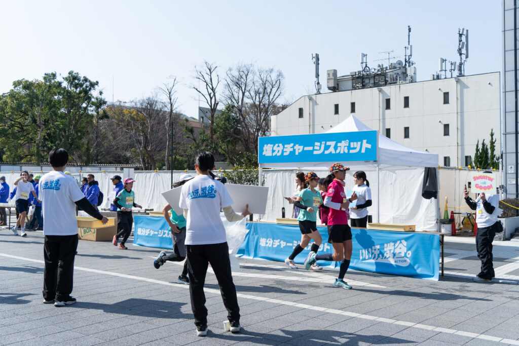レース中、もっとも過酷な瞬間に現れる「塩分チャージスポット」。 給水所に隣接して設置されたその場所は、ランナーの足を止めることなく、水分と同時に「塩分チャージタブレッツ」をクイックに補給できるスマートな動線を実現していました。