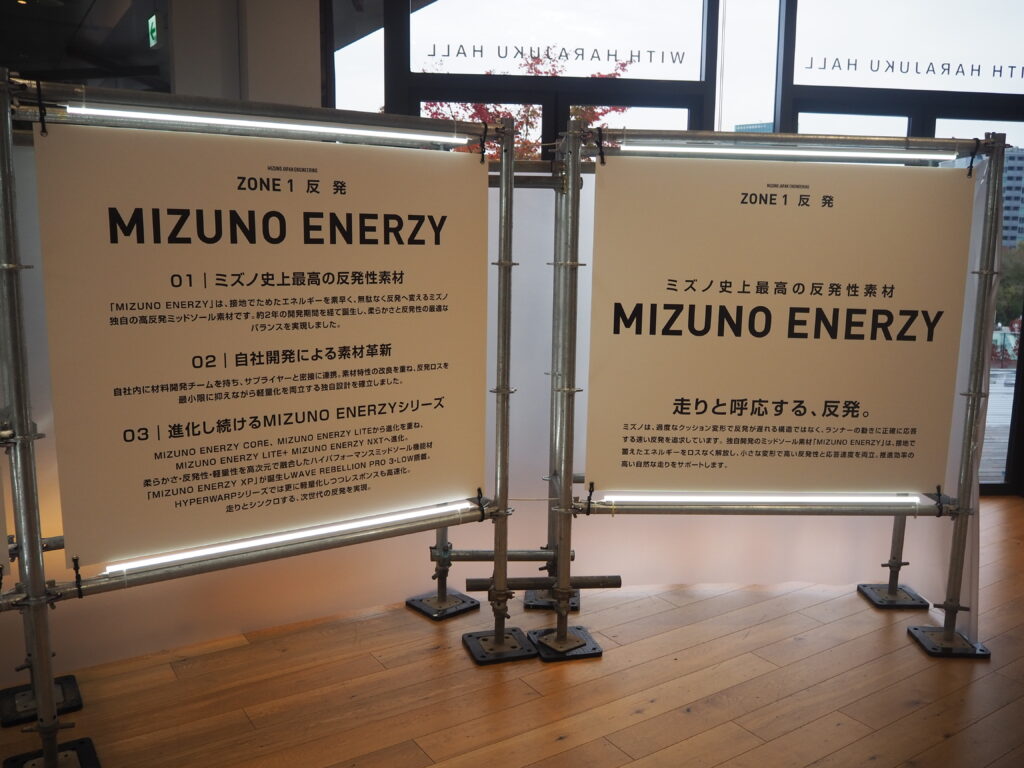 反発、安定、軽量、それぞれZONEに分かれてミズノのモノづくりへの向き合い方が分かる展示となっておりました。