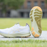 三代前の29に比べ、《ゲルカヤノ 32》の走りは、軽やか。自転車に例えるとギア1枚違うほど。シューズの軽量化以上に、明らかにペースが速くなる。同じように走っているつもりなのに、1㎞につき15秒以上も違う(あくまで筆者本人の感想)。