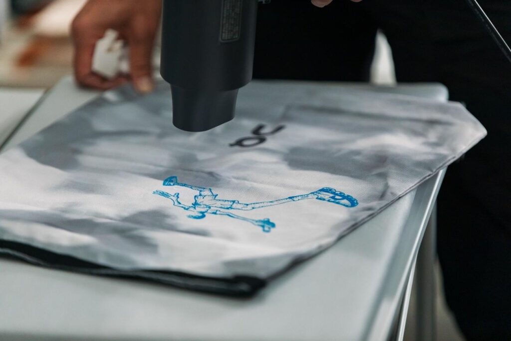 シルクスクリーンステーションでは、Onのプロダクトに、大会オリジナルデザインを印刷。シューバックやドローサック、各々のアパレルにプリントしたい人でブースは行列に。