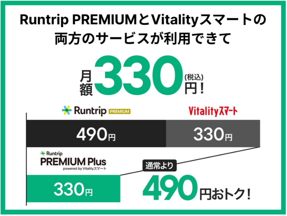 通常、Runtrip PREMIUM(月額490円)とVitality スマート(月額330円)をバラバラに契約すると月額820円かかりますが、このコラボプランなら、なんと月額330円(税込)ですべての機能が使えます 。これ、実質Runtrip PREMIUMが無料どころか、それ以上にお得になっている計算ですよね