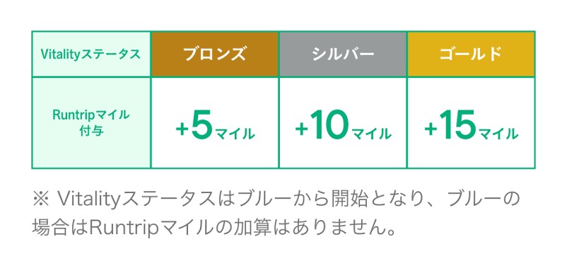 Runtripマイルが1.3倍速で貯まる 通常よりも効率よくマイルを貯めて、Runtrip Storeで最新ギアをお得にゲット。さらに、Vitalityのステータス(シルバー、ゴールド等)が上がれば、計測のたびに追加マイルまで付与されます。!